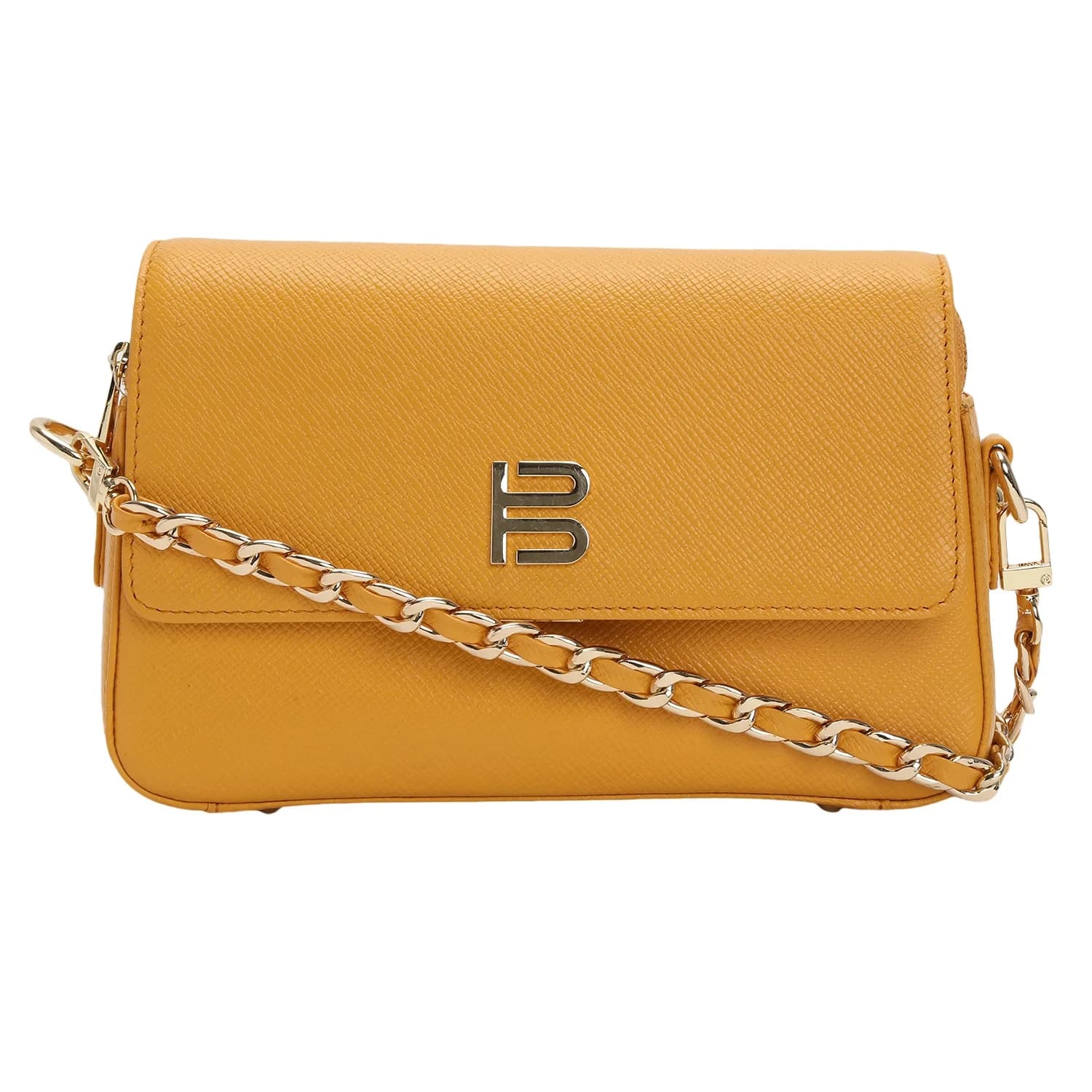 Radiant and captivating, BAGATT yellow cross body bag is a true statement of elegance. Crafted from genuine leather, its sleek design is complemented by a chic push lock and bold chain strap.