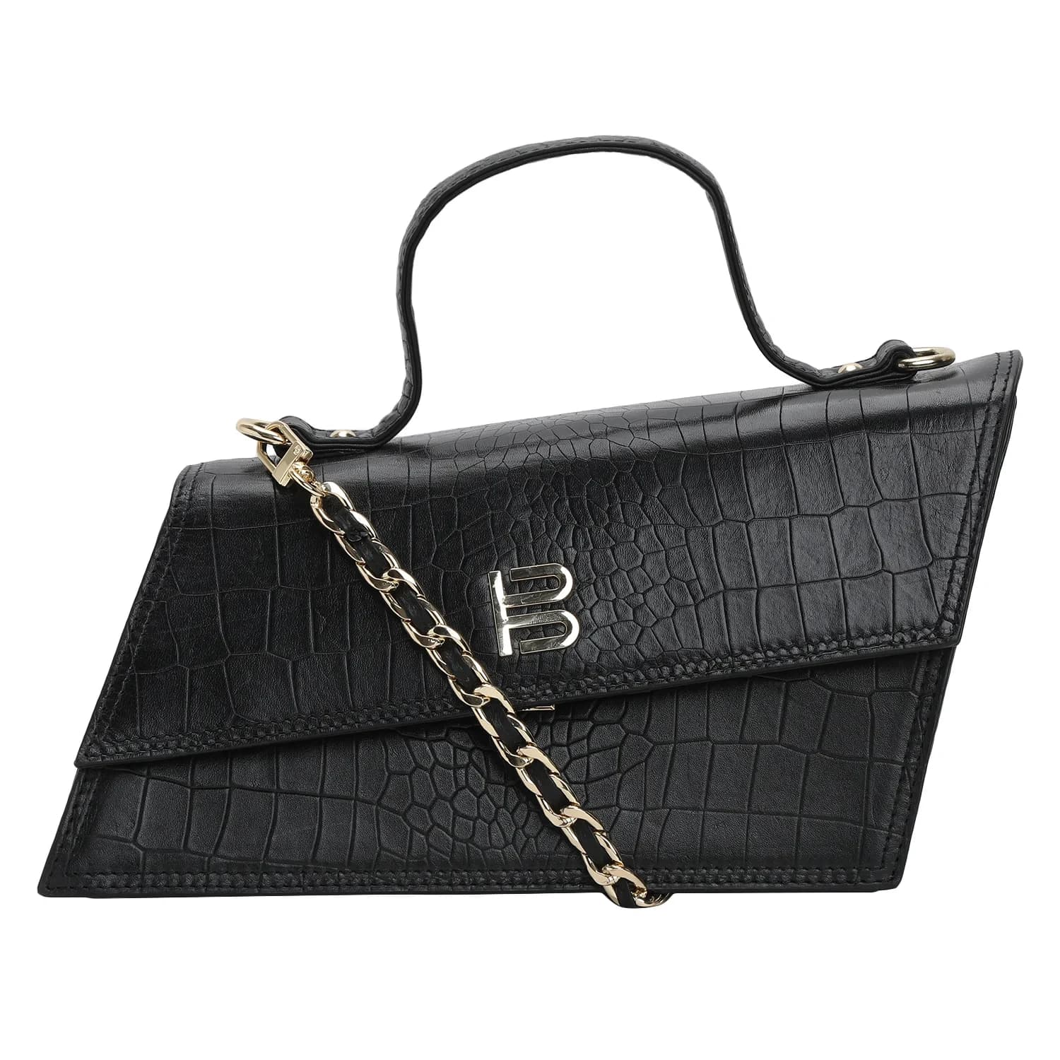 Stand out with unparalleled elegance with BAGATT black leather crocodile-print top handle bag – a fusion of edgy sophistication and timeless allure. Complete with a chic push lock and flap opening.