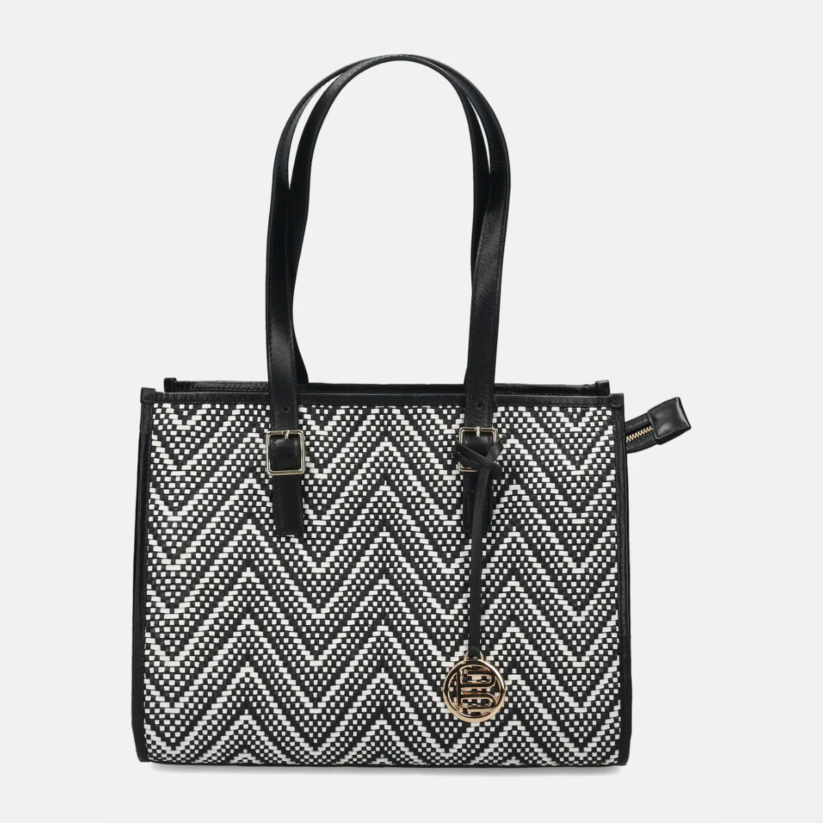 Sleek and adaptable, this black and white tote epitomizes both style and practicality. With its elegant shoulder strap and captivating weaving pattern, it's sure to become your favorite accessory.