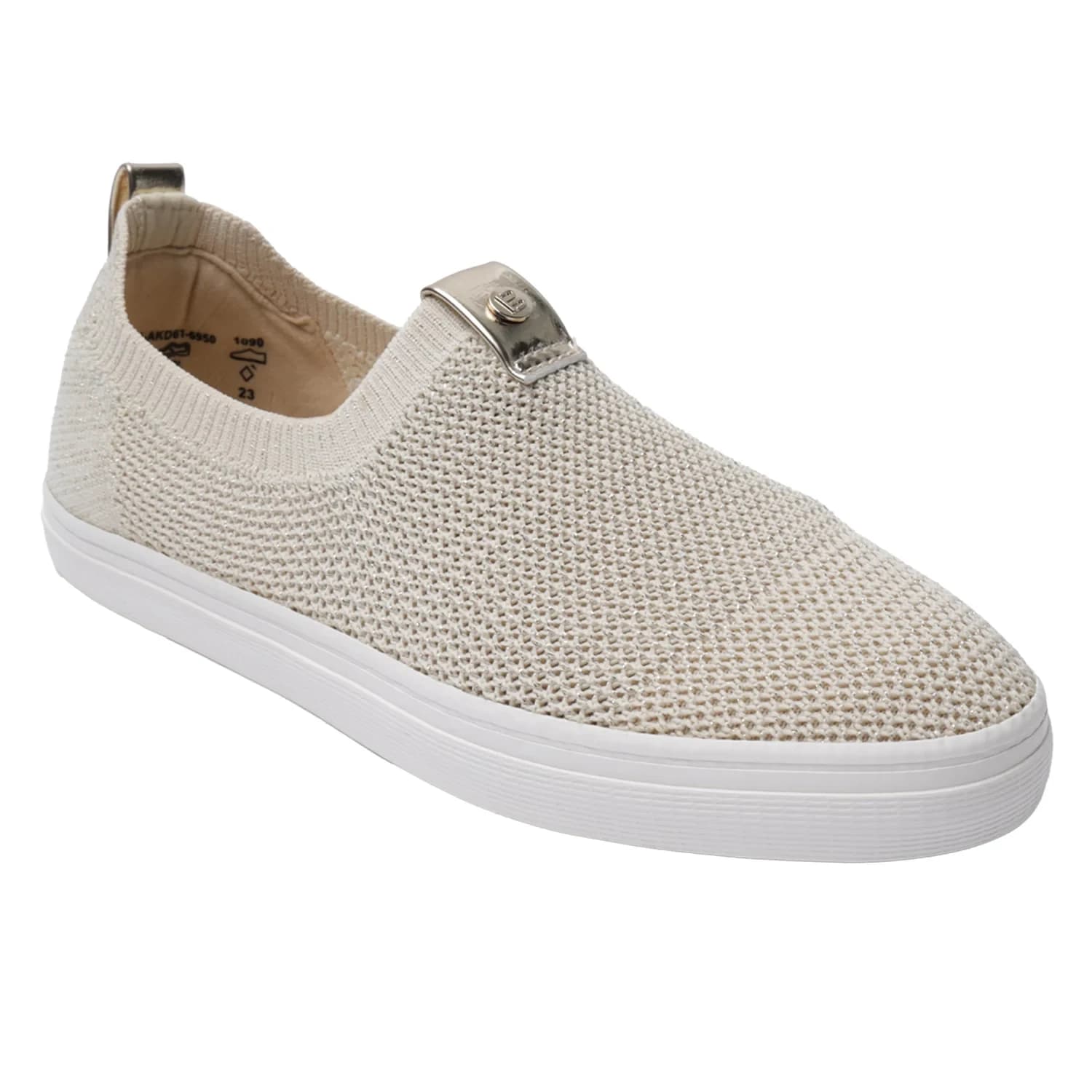 Immerse in earthy allure with Lali Beige/Gold casual slip-ons. Textile sophistication meets playful chic. Elevate your style by pairing with sleek culottes for a stunning, uniquely classy statement.